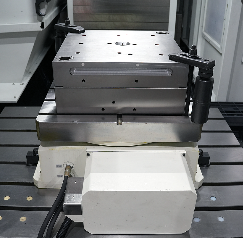 The WJ-800 frees operators from repeated heavy crane handling. At the center of the machine is a B-axis CNC rotary table with a gear-coupled indexing mechanism. Once the 2-ton mold base is gripped by the hydraulic clamps, it stays clamped until machining is fully complete.