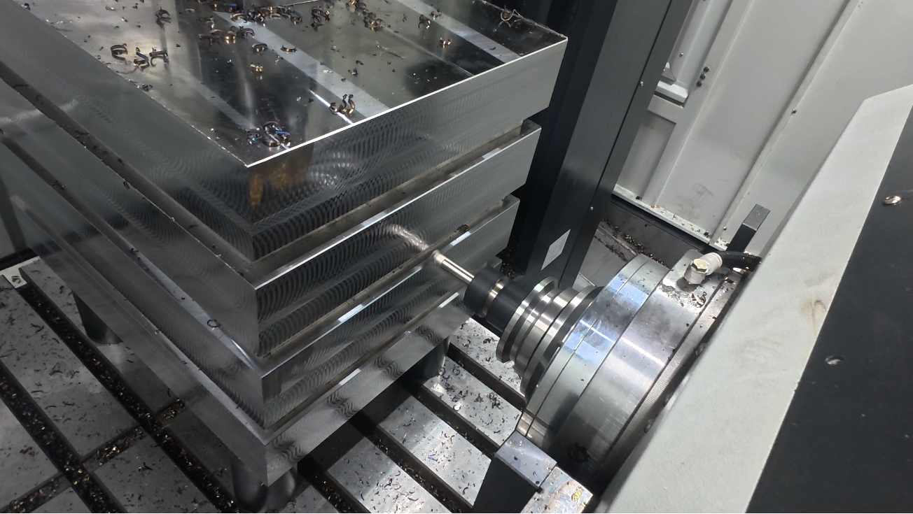 The B-axis indexing table has very limited spare weight capacity. A large 800 mm rotary table is rated for 1,200 kg. Switching to an aluminum tombstone frees up enough capacity to carry an additional 300 kg of workpiece material.