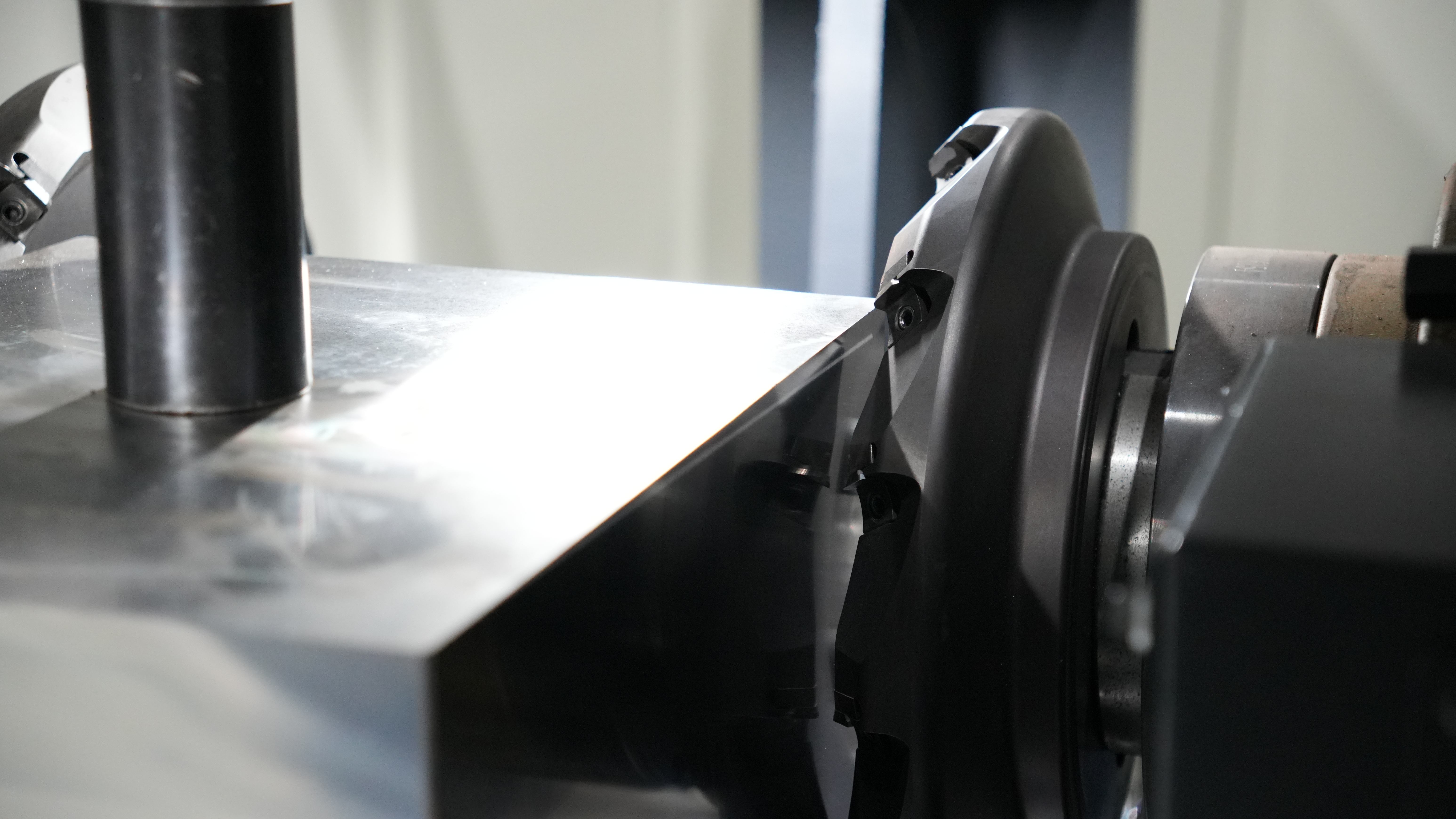 On a twin-head machine, each side carries a 22 kW high-power motor fitted with an eight-insert, 200 mm face mill. At 800 rpm, the two cutters bite into the steel block from opposite sides at the same time. The hundreds of kilograms of cutting force meet inside the workpiece and cancel each other out. Once the forces are balanced, the machine naturally runs more smoothly.